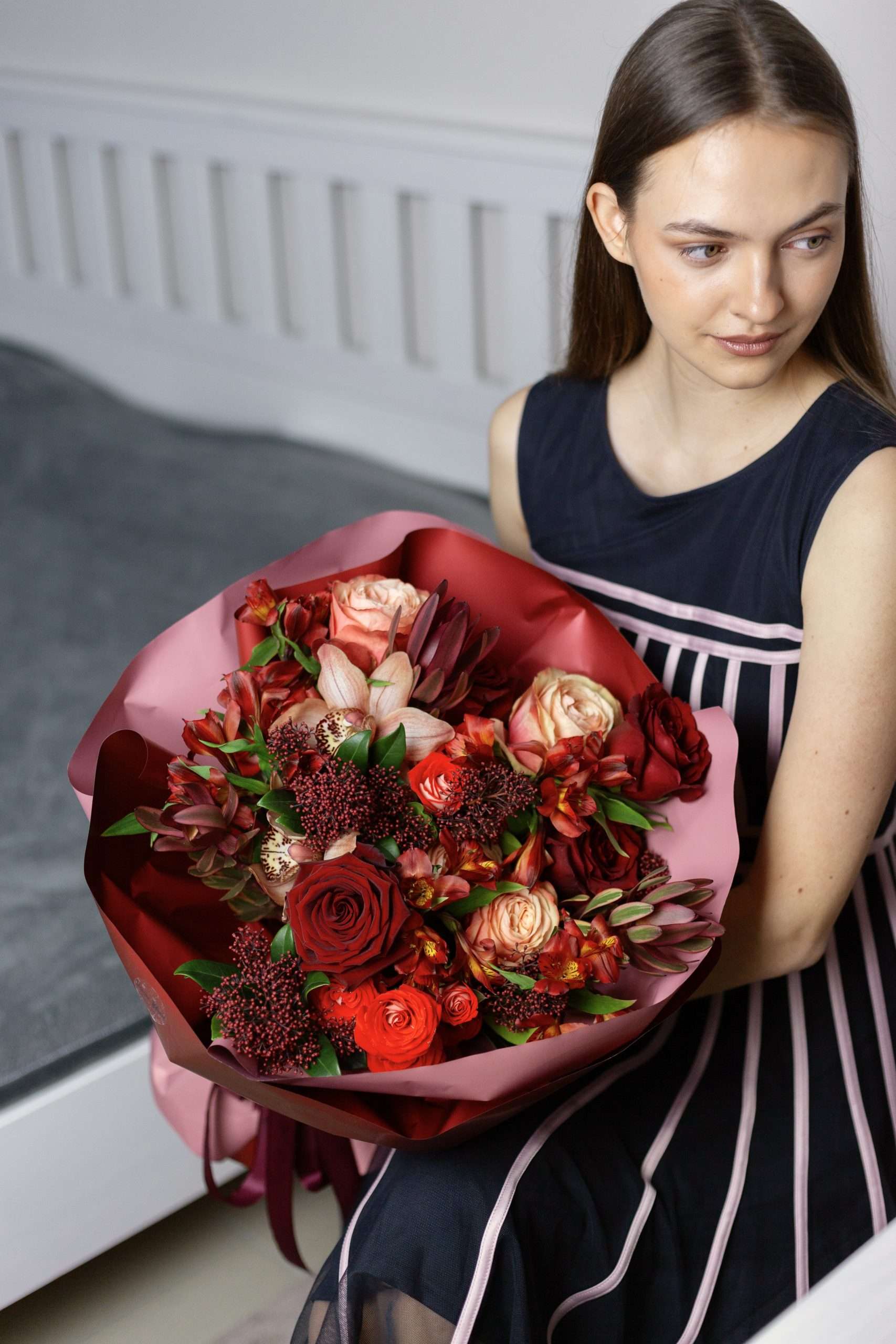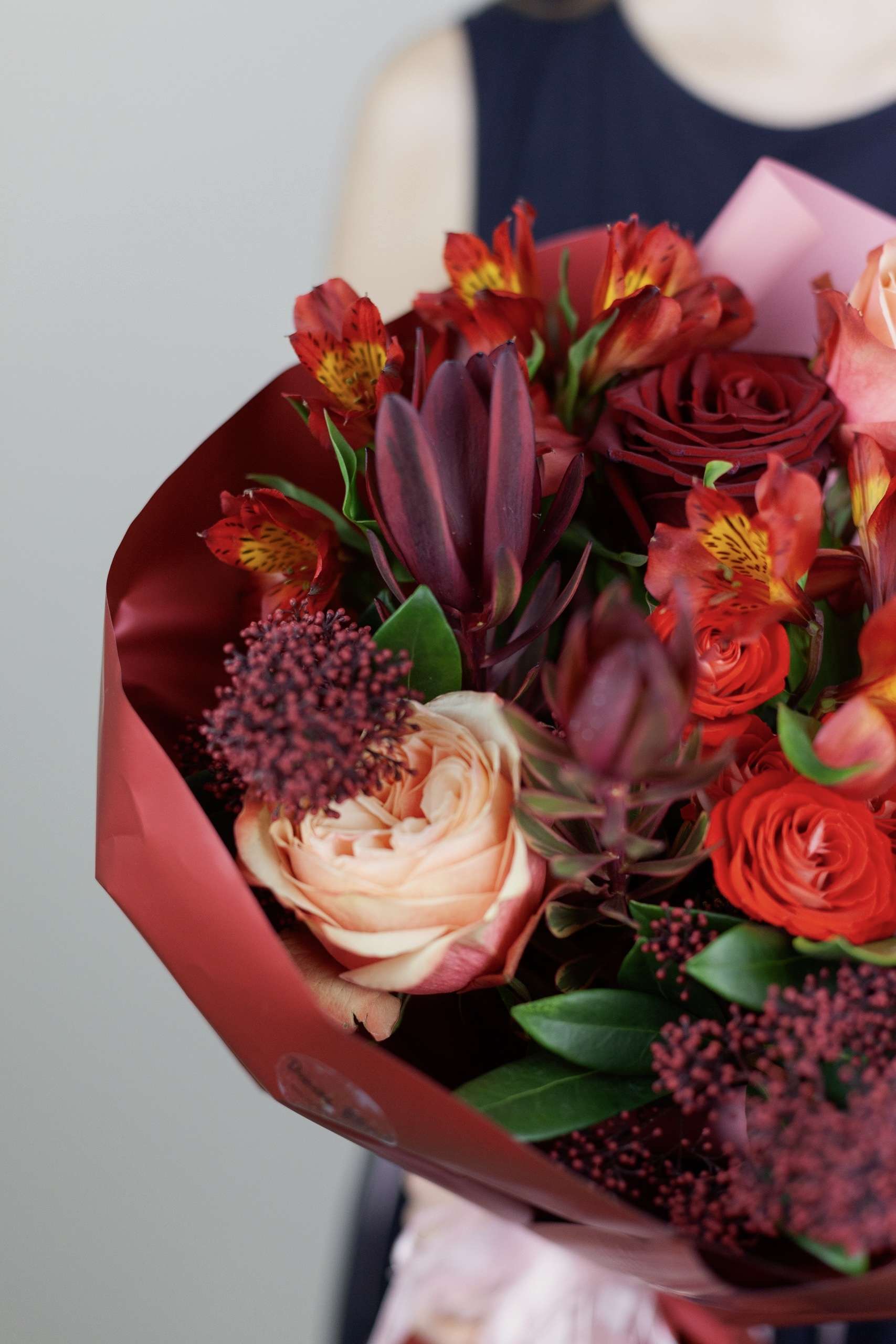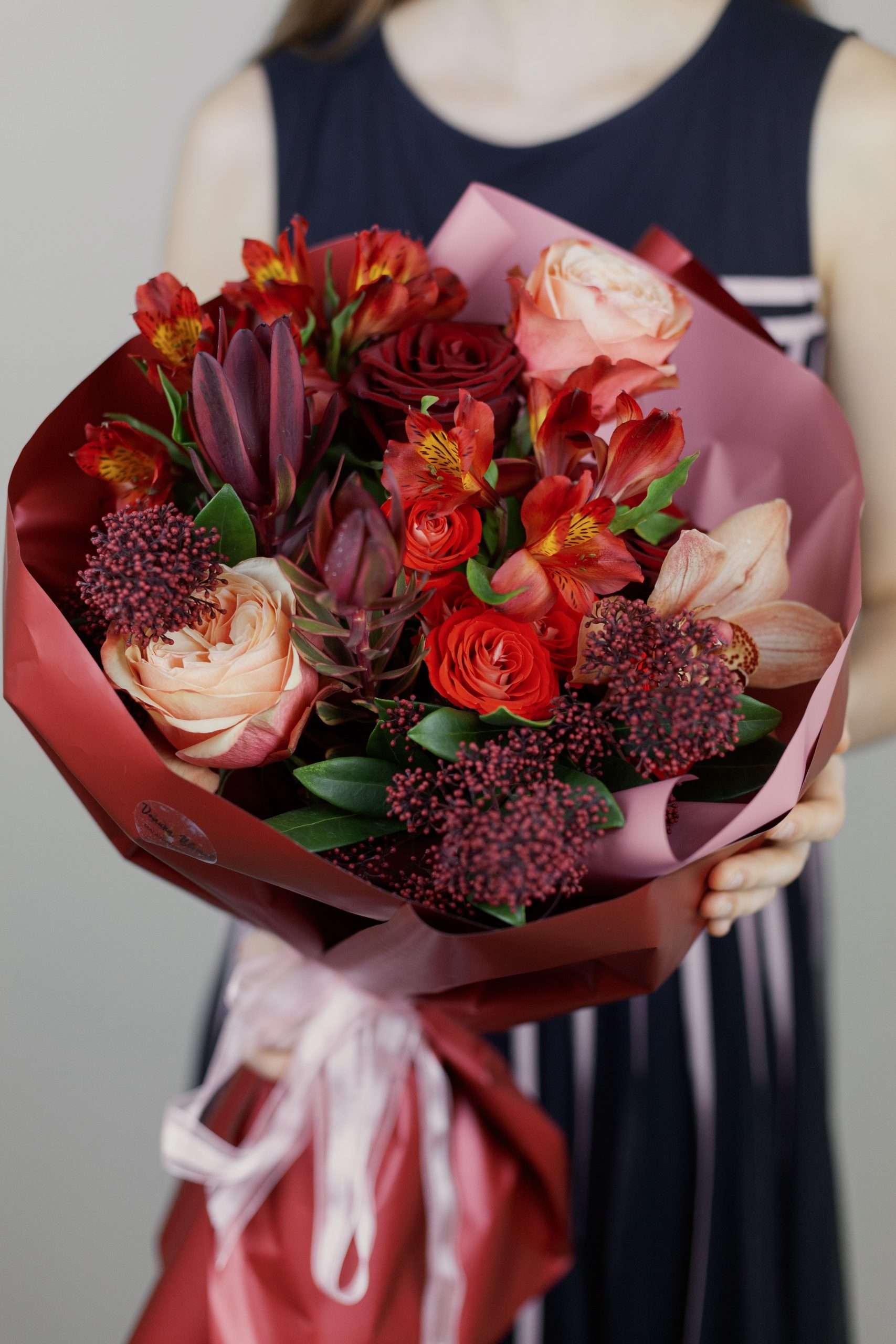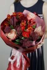 Для бескомпромиссных чувств. Букет из бордовых роз в обрамлении изысканной зелени и экзотических акцентов. Глубина цвета, игра текстур и безупречная элегантность. Выразите свою любовь без слов.