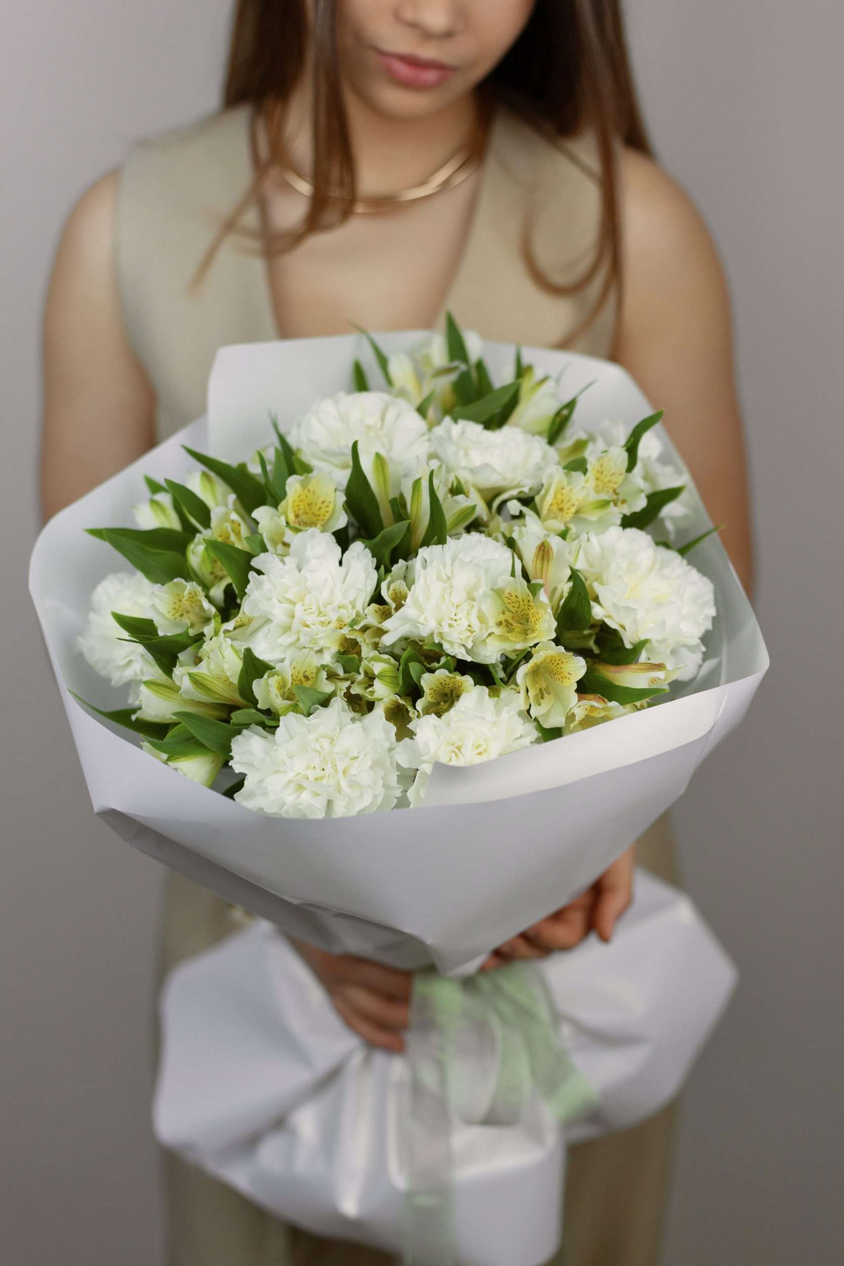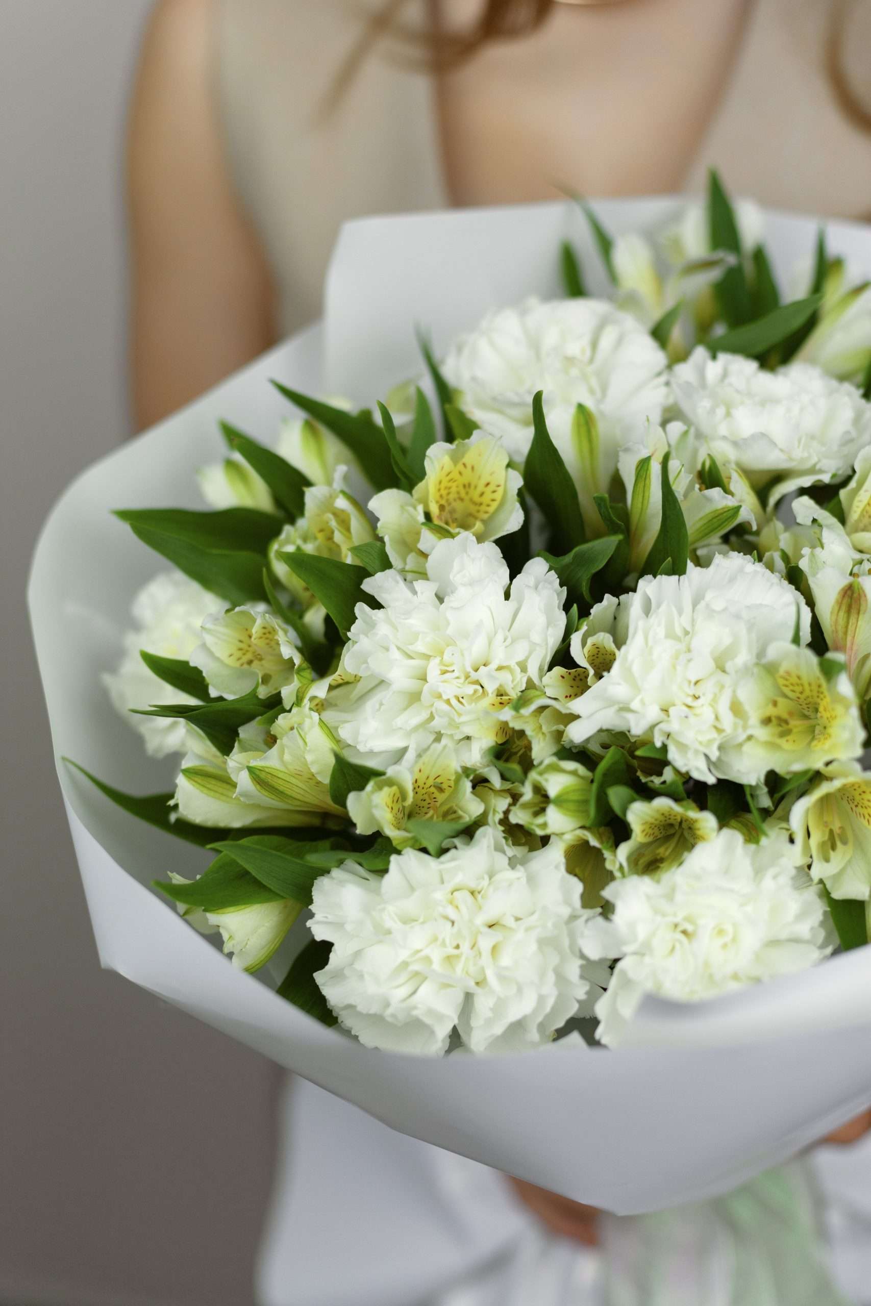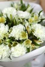 Идеальная гармония белоснежных диантусов и изящной альстромерии.